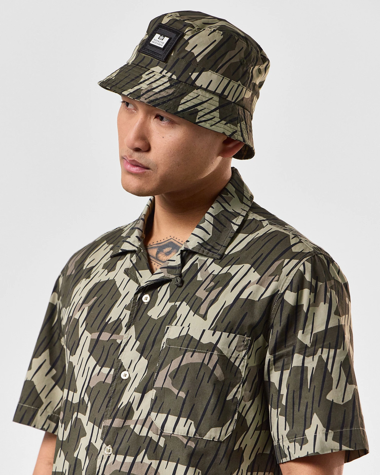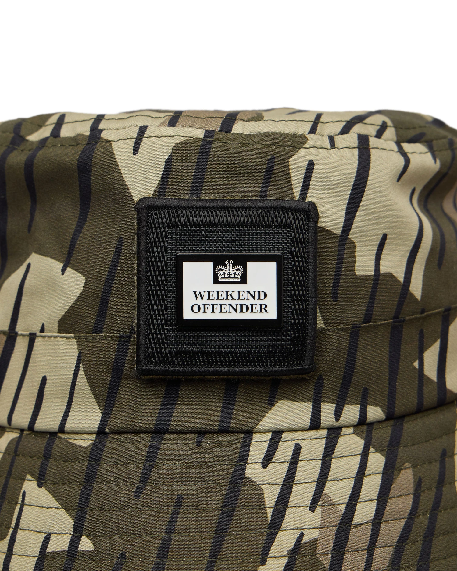 Summer essential bucket hat made from 100% woven Cotton with our own screen printed disruptive rain camo print.