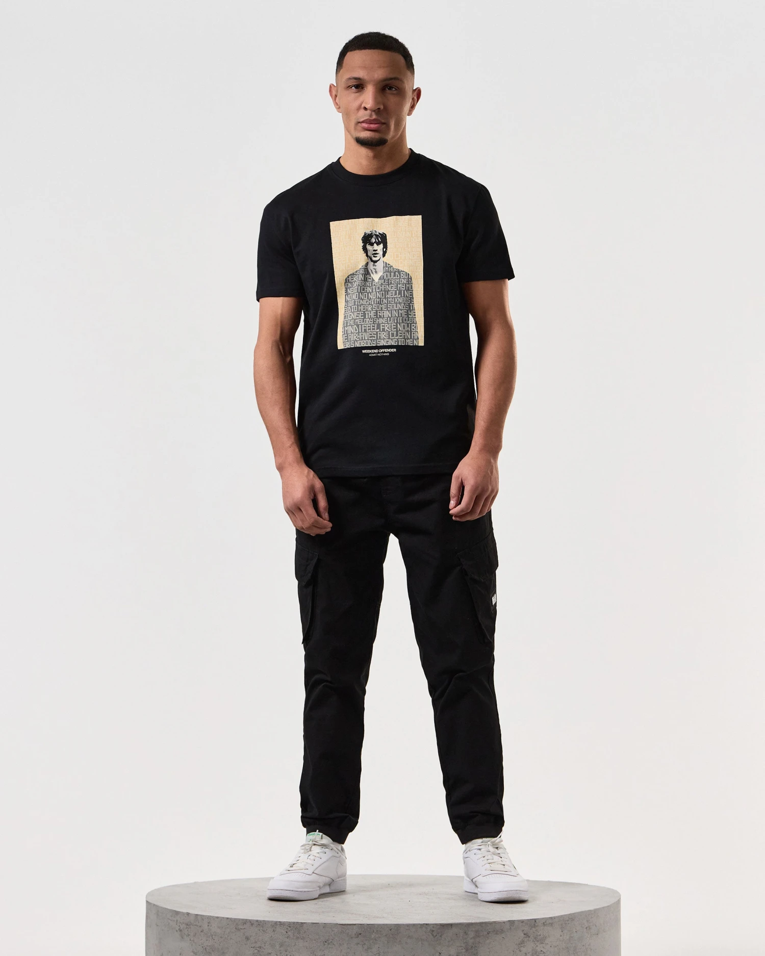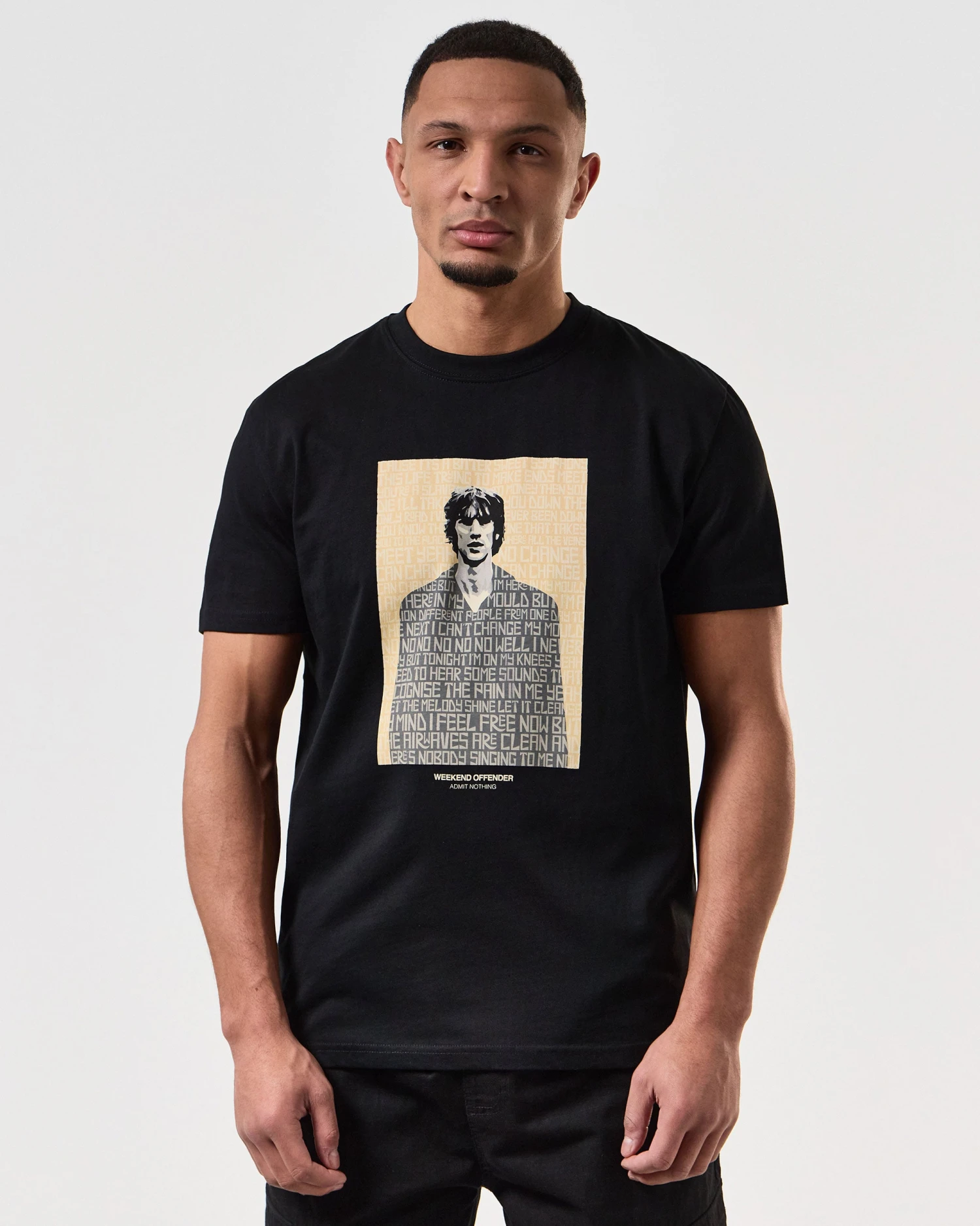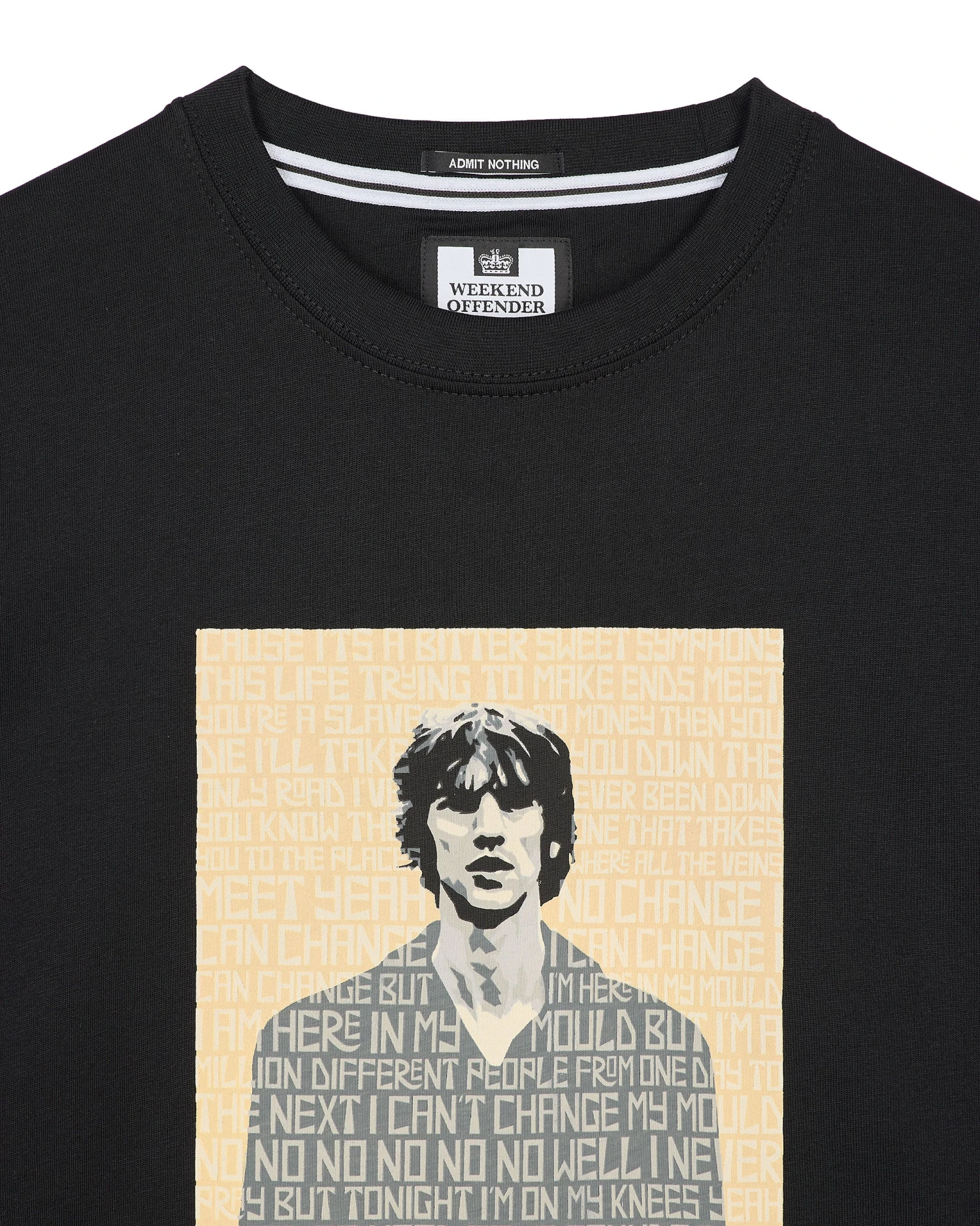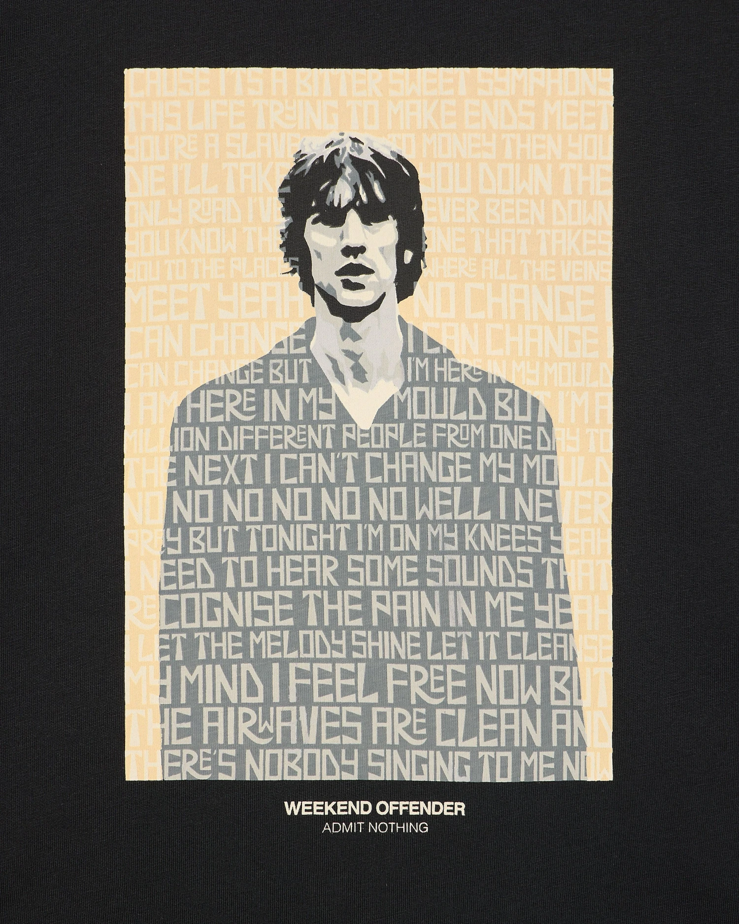 Graphic tee featuring the Lyrics from the Verve Song ‘Bittersweet Symphony’ surround lead singer Richard Ashcroft.